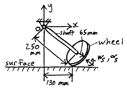 A wheel rolls along a level surface without slipping. The wheel is connected to a shaft which has a ball-and-socket joint at O, around which the shaft and wheel rotate, with a spin angular velocity of