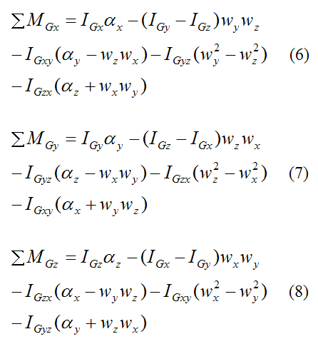 The equations (6)-(8) and the Euler equations apply for moments summed about the center of mass
