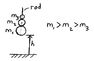 m3, which have a thin rod threaded through them, allowing the balls to slide freely along the rod. The toy is dropped from a height