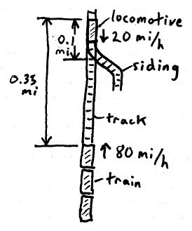 A train is moving at high speed on a straight track, while at the same time a locomotive is moving in the opposite direction on the same track. In order to avoid a collision, the locomotive must move on to the siding before a collision becomes unavoidable. At the same time, the train must decelerate by putting the brakes on. At the instant shown, the front of the train is 0.35 mi from the back of the locomotive, the back of the locomotive is 0.1 mi from the siding entrance, the speed of the train is 80 mi/h, and the maximum speed of the locomotive is 20 mi/h. What is the minimum deceleration of the train?