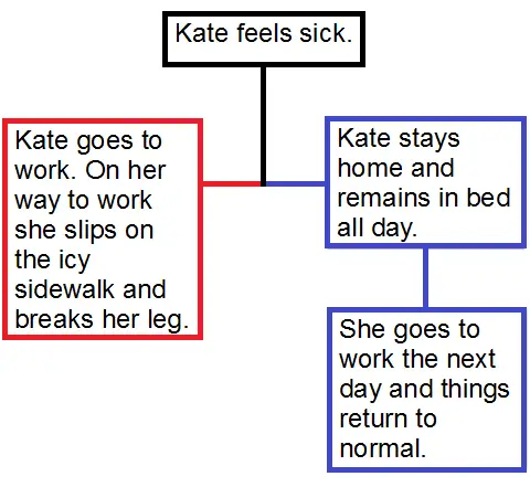 As a fun exercise I drew a flow chart illustrating the idea behind parallel universes. Let's imagine a situation where we have someone, let's call her Kate, and she feels sick. And let's say that for the sake of argument there is a quantum event in her brain that either makes her decide to go to work or stay home. At the instant she makes the decision the universe splits into two to accommodate each possible outcome (her staying home