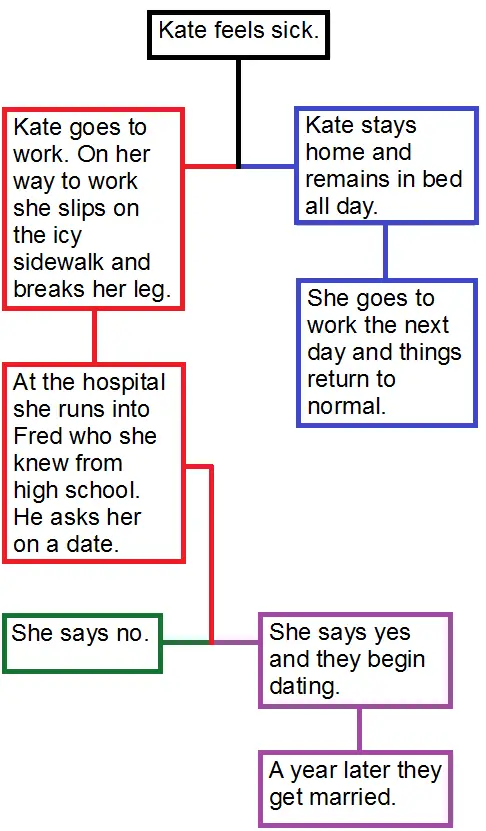 The red outcome shows that, as a continuation of her decision to go to work, Kate has fallen and broken her leg. As a result she ends up in the hospital. Now imagine further that at the hospital she runs into an old friend Fred which she knew from high school. Fred asks her out on a date, and due to another quantum event in her brain she either says yes or no. Once again, when she makes the decision, the universe splits in two to accommodate each outcome. This is shown in the continuation of the flow chart, shown below. The color green represents her saying no and the color purple represents her saying yes.